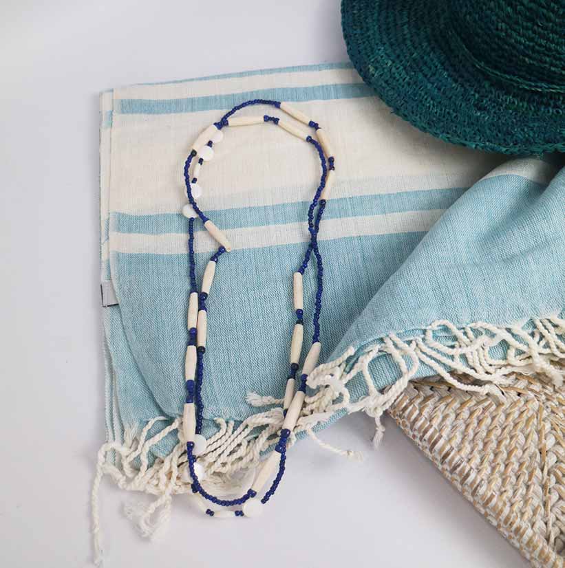 NECKLACE SHELL BUTTON CREAM BLUE BONE PIPE