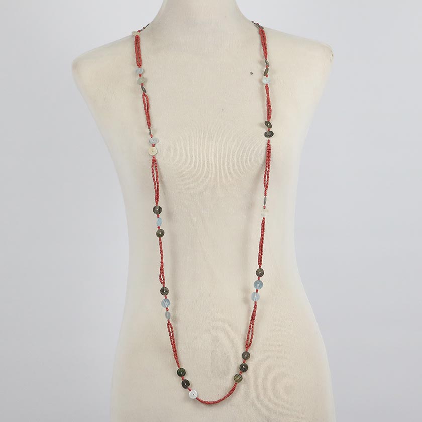 / NECKLACE SHELL BUTTON RED BEAD LONG